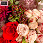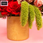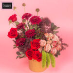 Berry Mocha — a warm autumn medley of Red Roses, Cappuccino Spray Roses, Chrysanthemums, and Scabiosa with seasonal textures of Hypericum, Cotinus, and Panicum, arranged in a golden ceramic vase for a touch of elegance.