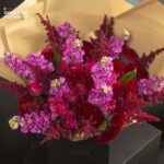 A hand-tied bouquet of red Celosia, red Astilbe, pink Matthiola, and pink Garden Roses.