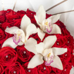 A romantic hand-tied bouquet featuring velvety red Roses and elegant Cymbidium orchids, accented with sparkling crystal pins for a luxurious finish.