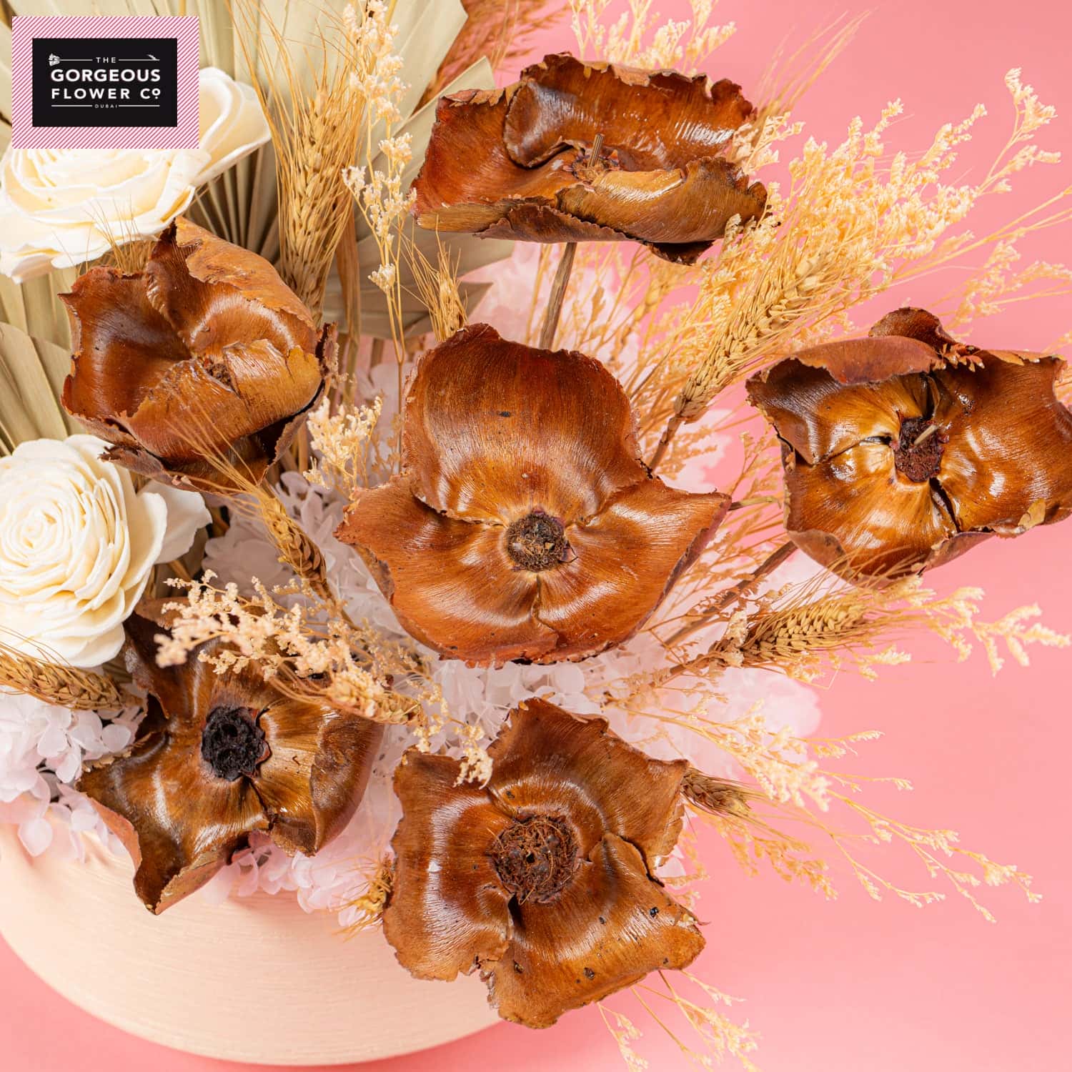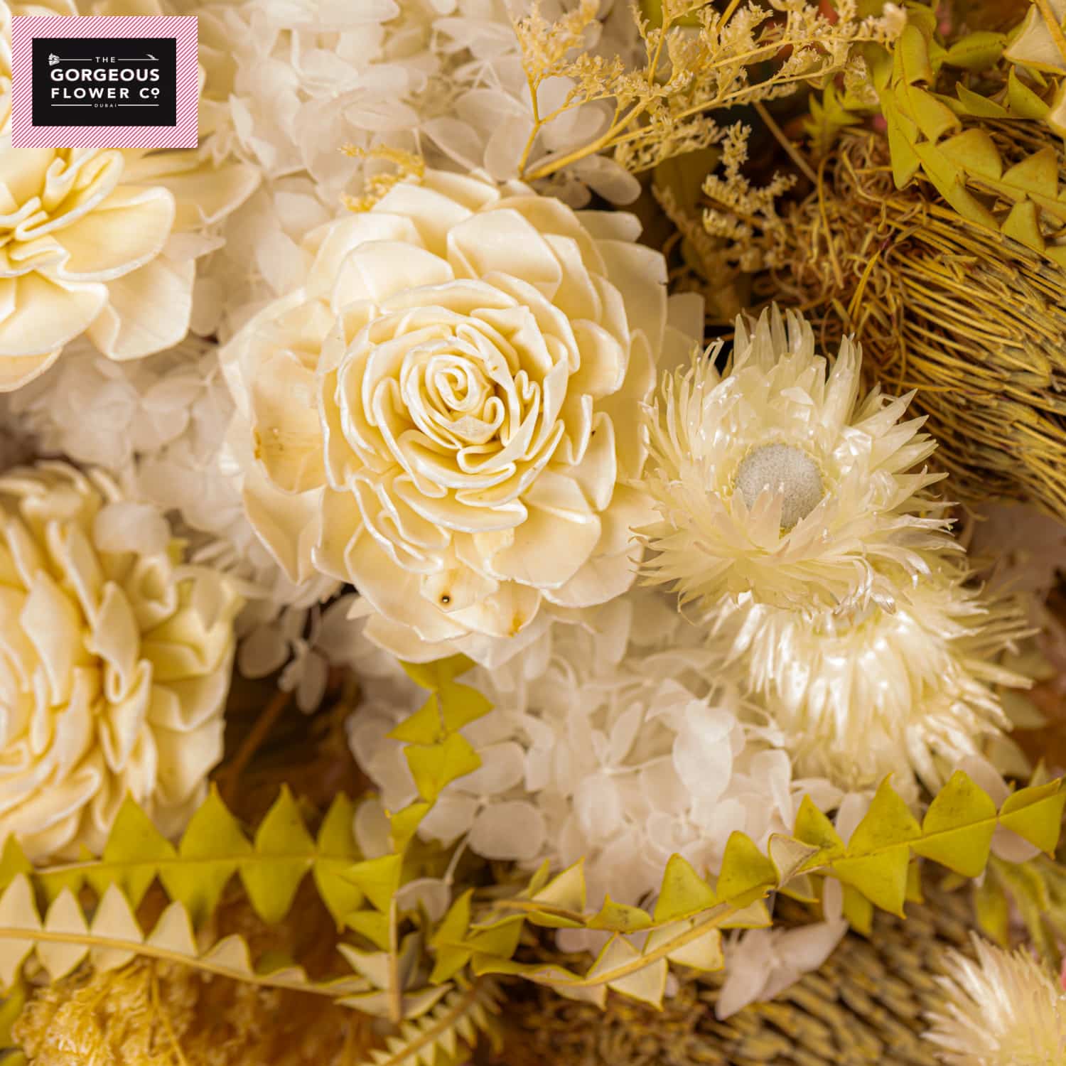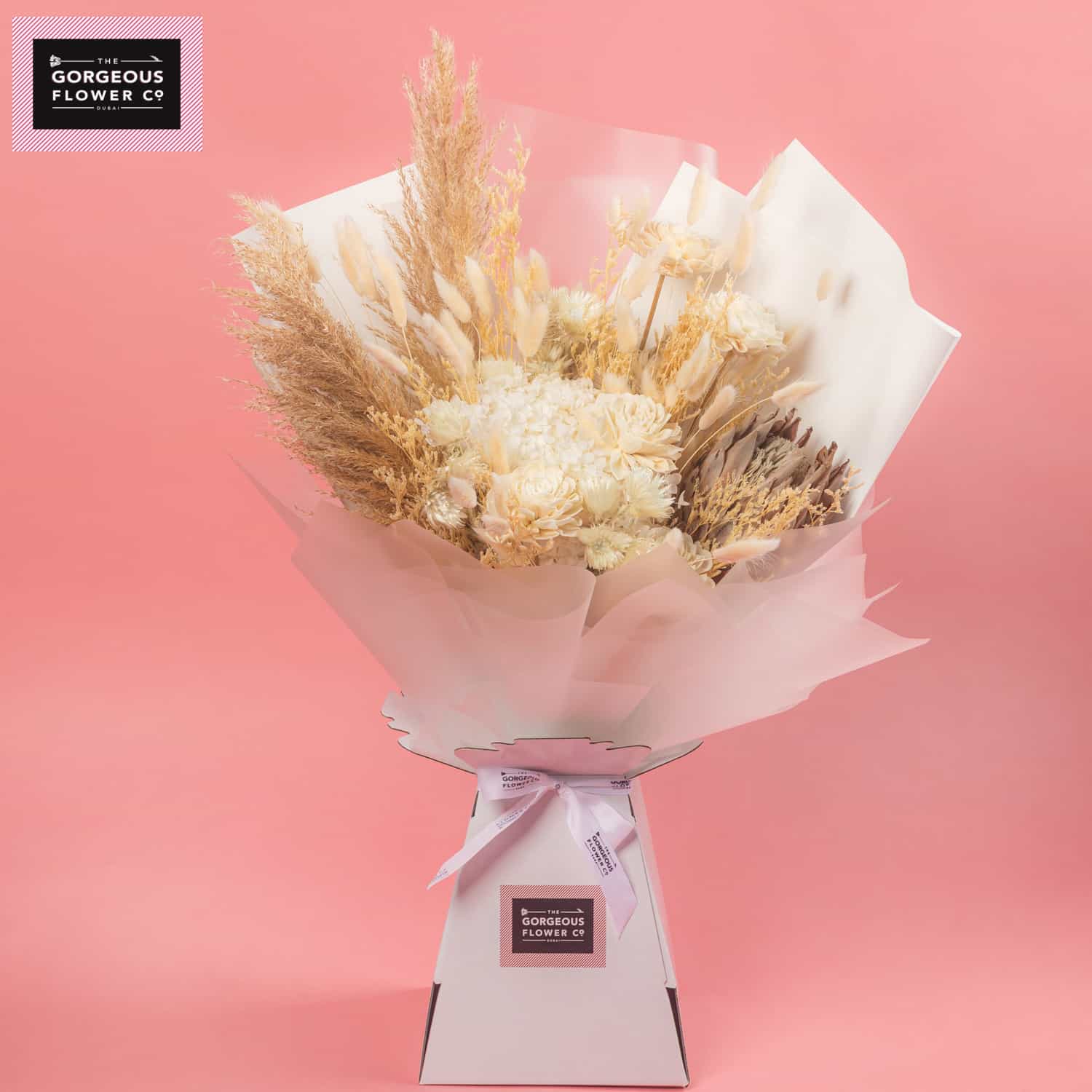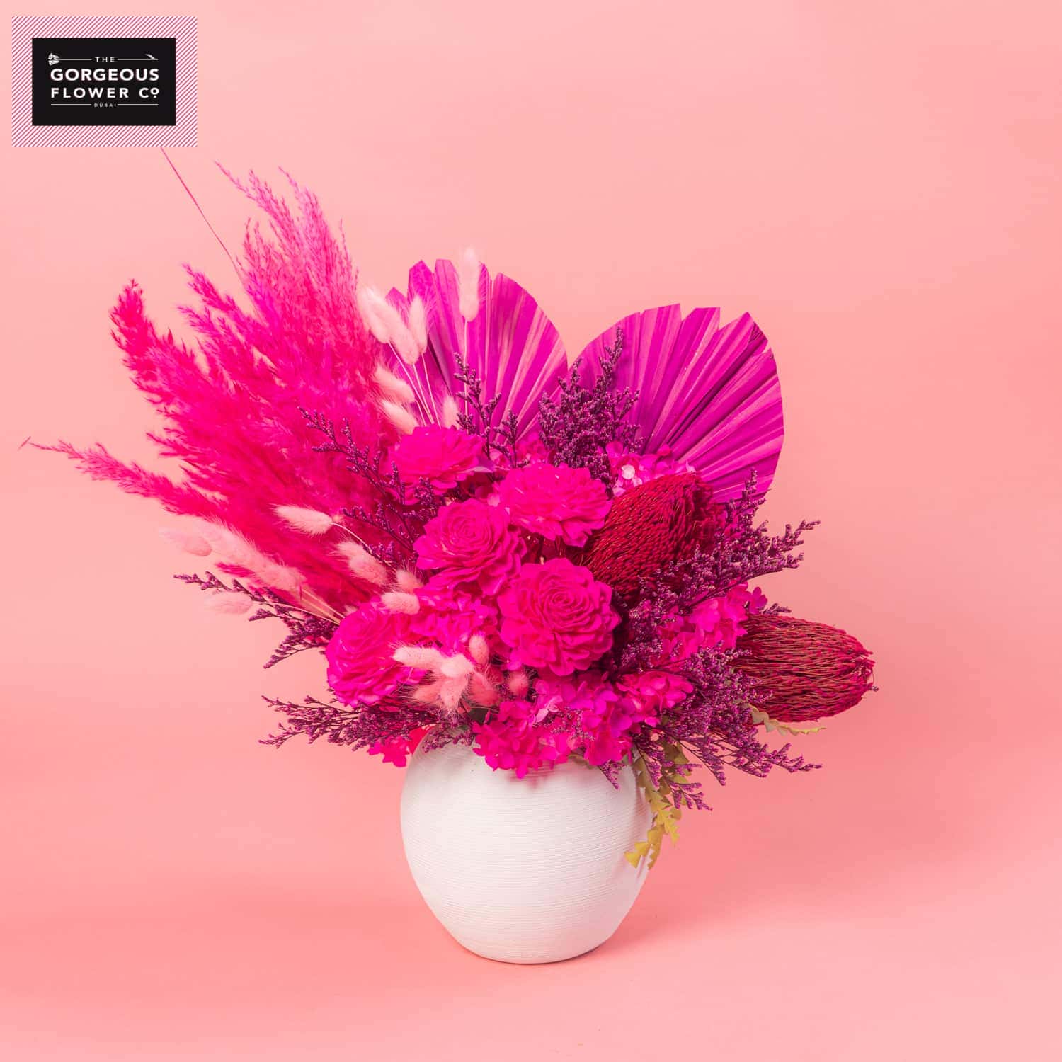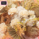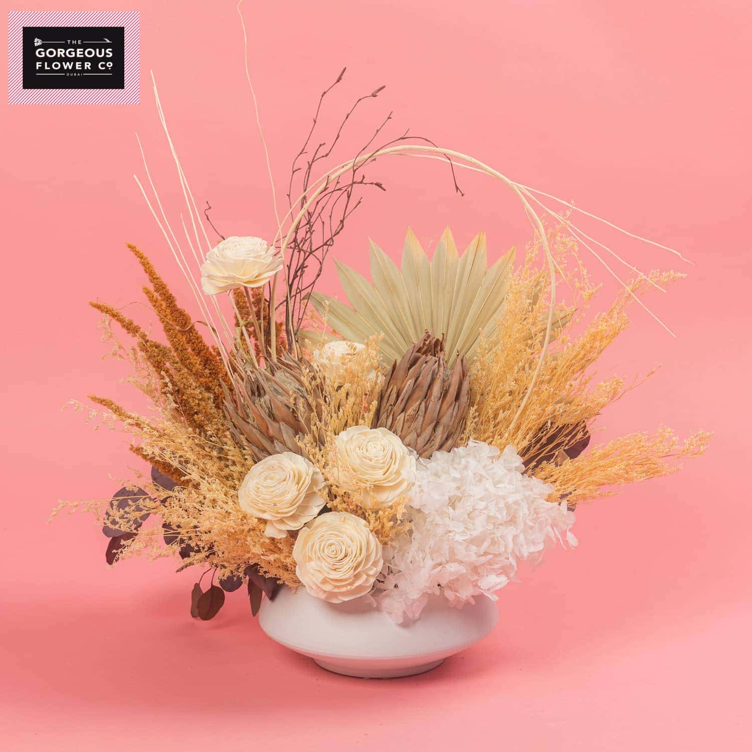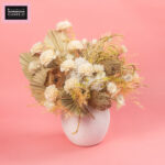 A stunning dried arrangement in a white ceramic vase, featuring Palm spear, white Hydrangea, Rosa Sola, Banksia, Limonium, Palm Cap, and Capblumen, bringing textured elegance and timeless beauty to any space.