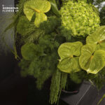 A deep green glass vase arrangement with green Hydrangeas, Anthuriums, Green Trick, Asparagus leaves, Panicum fountain, and cascading Amaranthus.