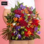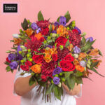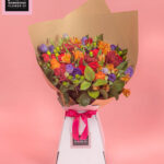 A romantic, autumn-inspired bouquet bursting with warm, seasonal hues. Featuring bold Chrys Red, passionate Red Roses, fiery Alstro Orange, vibrant Hypericum, delicate Lisianthus, radiant Orange Roses, elegant Spray Roses, and lush Ruscus, Falling for You brings the cozy, golden spirit of fall with a playful, stylish twist—perfect for adding warmth and charm to any space.