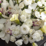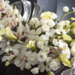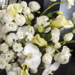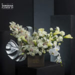 A bronze luxe box arrangement with white Cymbidium, Calla Lilies, Ranunculus, Lisianthus, Phalaenopsis orchids, and shimmering silver Monstera.