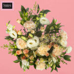 A sweet jar filled with peach spray Roses, white Lisianthus, Wax flower, cream Carnations and fresh Ruscus – the perfect thank-you for a special teacher.