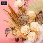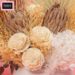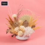 A sophisticated dried arrangement in a white ceramic vase, featuring Palm spear, white Hydrangea, Rosa sola, Protea, Limonium, Jab grass, Eucalyptus, and Betula,bringing natural elegance and modern charm to any space.