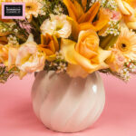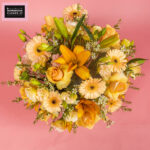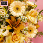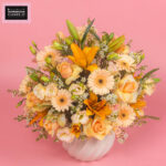 A dreamy autumn-inspired bouquet blending the soft elegance of Asiatic Lily, the delicate charm of Lisianthus Peach, vibrant Gerbera Peach, creamy white Wax, and romantic Peach Rose. Perfect for adding a pop of warmth and chic sophistication to any space.