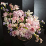 A rose-gold vase arrangement with pink Hydrangea, Candy Girl Roses, pink Calla Lilies, lilac Lisianthus, and white Cymbidium orchids.