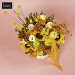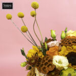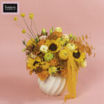 A vibrant autumn arrangement featuring Sunflowers, Orange Roses, Chrys Orange, Lisi Peach, Lotus Orange, playful Craspedia, Alstro orange, Chasmantium dried orange and Amaranthus orange— bursting with seasonal warmth and charm