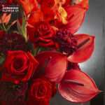 A textured glass vase arrangement with red Gladiolas, Roses, Anthuriums, Chrysanthemums, and a delicate Palm spear.
