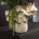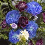 An abstract ceramic vase arrangement with blue Delphiniums, painted blue Chrysanthemums, purple Carnations, lilac Lisianthus, Oxypetalum, Ornithogalum, and cascading Amaranthus.