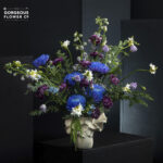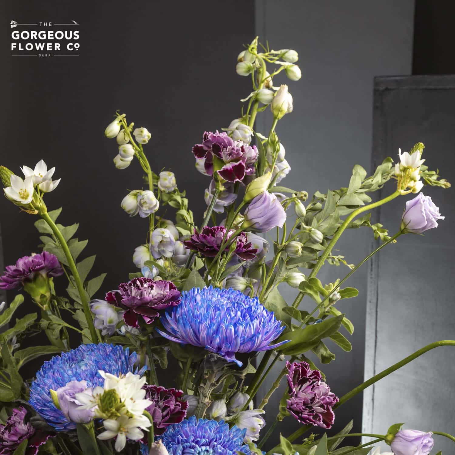 An abstract ceramic vase arrangement with blue Delphiniums, painted blue Chrysanthemums, purple Carnations, lilac Lisianthus, Oxypetalum, Ornithogalum, and cascading Amaranthus.