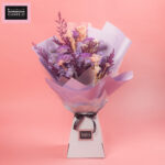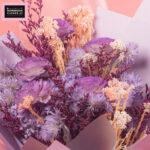 A hand-tied dried bouquet with Rosa sola, Rice flower, Purple limonium, and Capblumen,textured blooms in soft purple tones reminiscent of a desert evening.